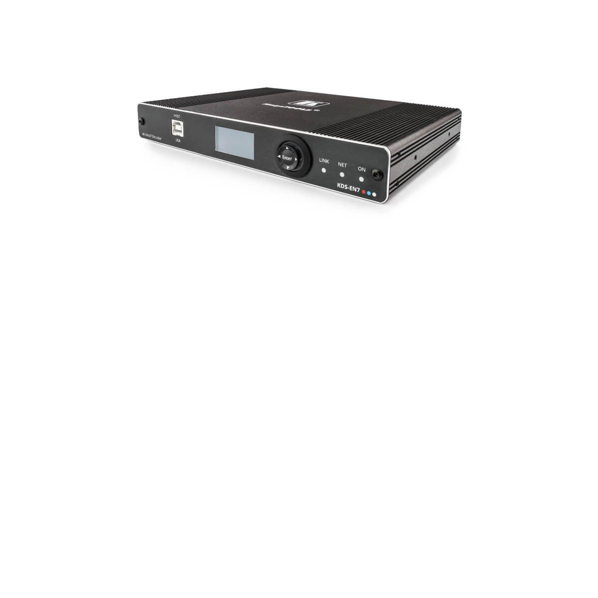 Kramer AV KDS-EN7, manufactured by Kramer Electronics , is a powerful AVoIP encoder from the KDS-7 series. The device enables its user to encode AV signals and convert them into a data stream format that can be transmitted across the IP network to a decoder or a group of decoders with minimal loss in video quality. This encoder features support for video resolutions up to 4K@60Hz with embedded audio over HDMI, utilizing the H.265 (HEVC) standard for efficient video compression. It can be used as a part of a video distribution system to display videos on large-scale video walls.