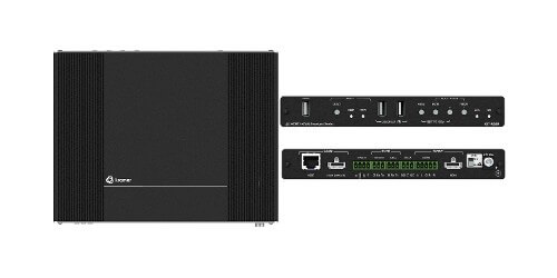 KIT 500 is a high-performance integrated matrix scaler kit, consisting of the KIT 500T matrix transmitter with two USB-C and two HDMI/USB inputs independently routable to HDMI and HDBT outputs, and the KIT 500R auto-switcher scaler receiver with an HDMI input for routing a local signal and an HDBT input for routing a remote signal (from the KIT 500T transmitter). The remote USB peripherals (such as a room camera) are extended for use of local USB host for convenient hybrid meeting operation with both room and online participants.