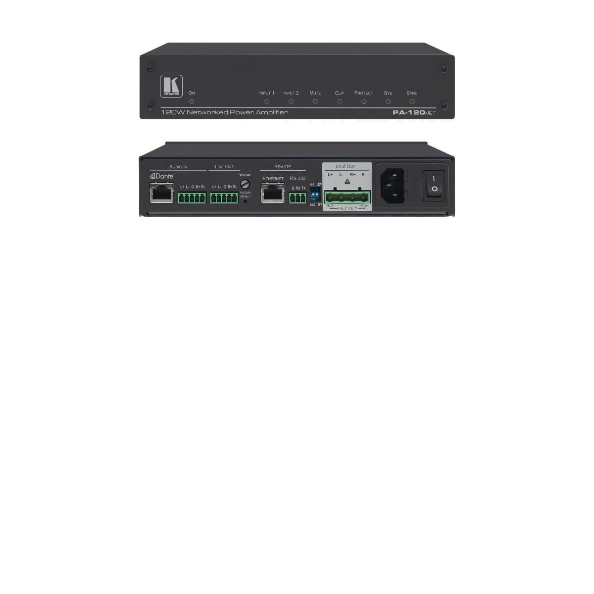 PA-120Net is a high-performance, selectable Hi-Z (70V/100V) or Lo-Z (4 Ohm/8 Ohm) power amplifier featuring balanced and unbalanced inputs, additional line-level output and Dante interface. This versatile amplifier features built-in DSP, auto-standby and maximum durability. PA-120Net is suitable for a vast range of AV installations.