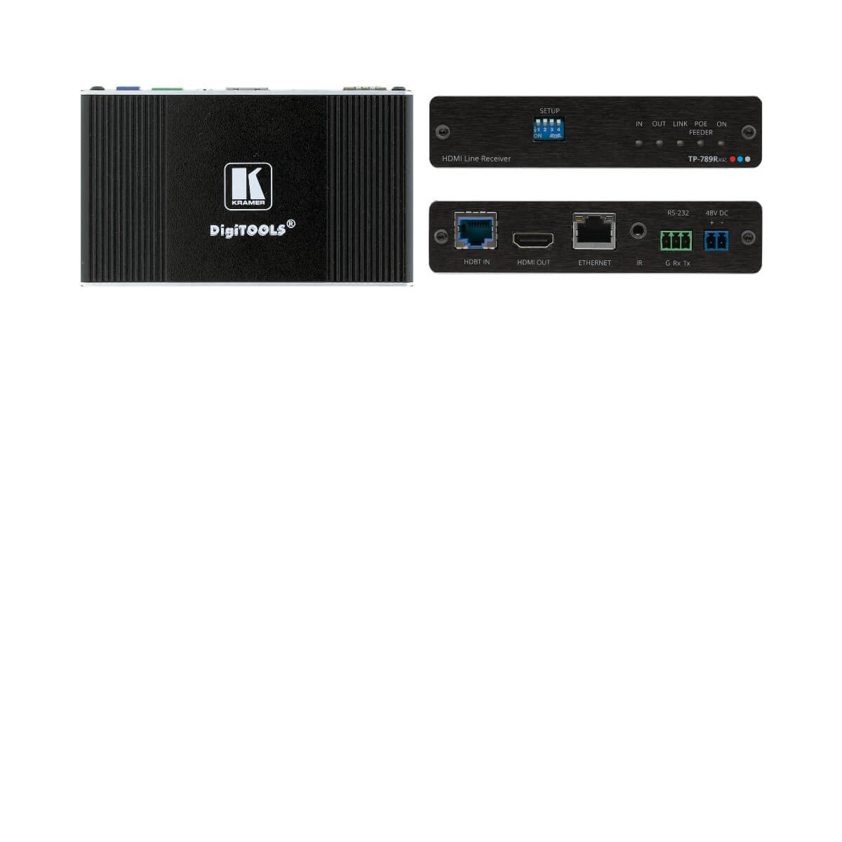 TP-789Rxr is a high-performance, extended-reach HDBaseT receiver for 4K60Hz (4:2:0) HDMI, Ethernet, RS-232 and IR signals and 2-way powering over twisted pair. It extends video signals to up to 100m (330ft) over Kramer copper cables at up to 4K@60Hz (4:2:0) 24bpp video resolution and provides even further reach for lower HD video resolutions. This receiver either provides power over the copper extension cable to a POE (Power over Ethernet) acceptor device such as a PoE wall-plate, or accepts PoE through the extension cable from a PoE provider remote device, as auto-sensed by the receiver.