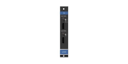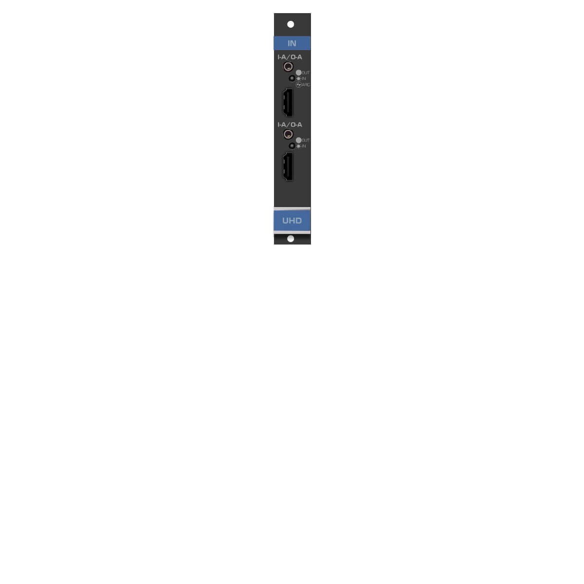 UHDA−IN2−F16 is a two−channel 4K@60Hz (4:2:0) HDMI input card with configurable analog audio features for the VS−1616 Series Modular Multi−Format Digital Matrix Switchers. The UHDA−IN2−F16 inputs two 4K HDMI signals with selectable ARC (on the upper port), embedded, or de−embedded unbalanced stereo audio.
