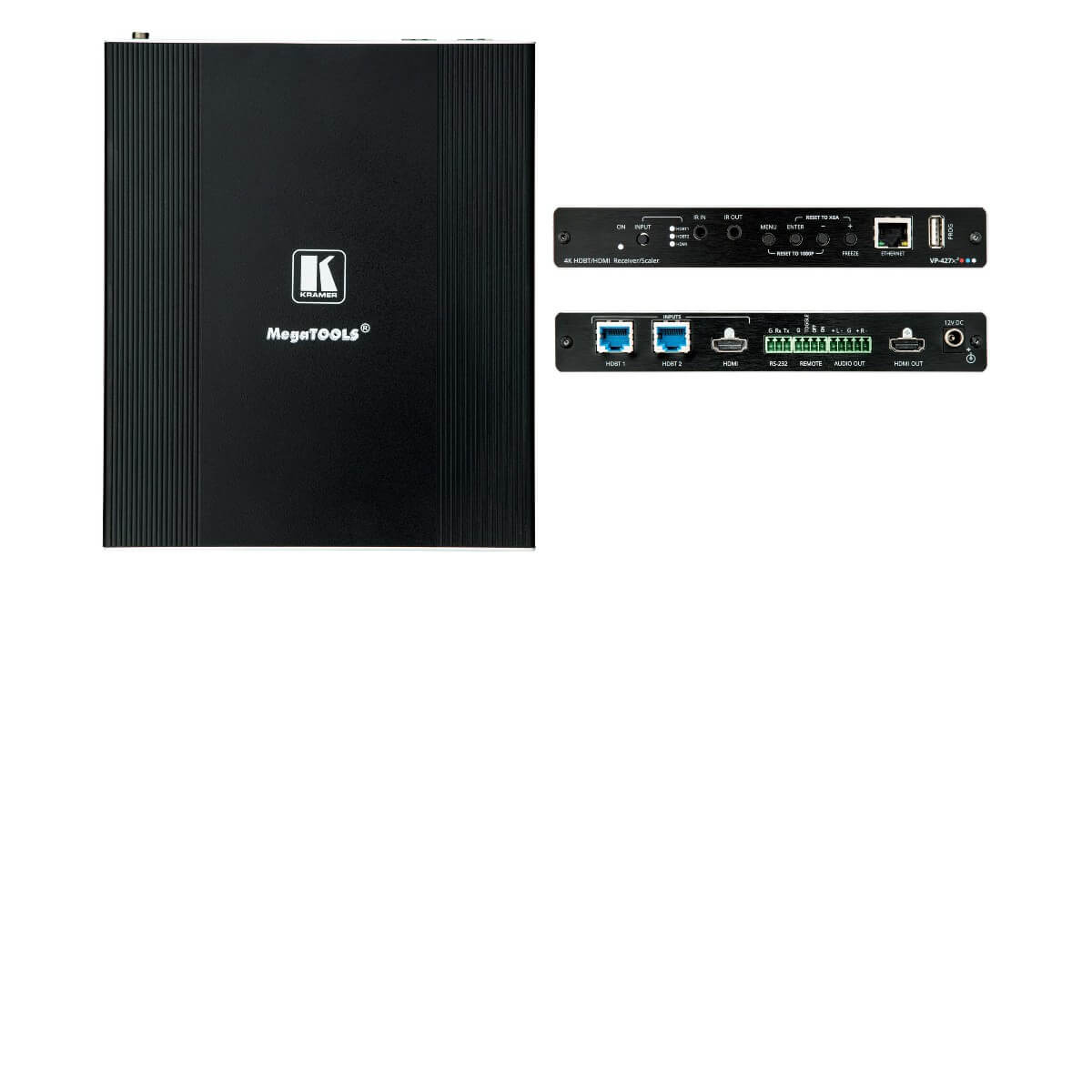 VP-427X2 is a high-performance auto-switcher/scaler receiver with 2 HDBaseT inputs and a local HDMI input for 4K HDMI over extended-reach HDBaseT. It supports automatic and manual glitch-free switching between the 3 inputs, and up- or down-scaling to any resolution up to 4K@60Hz (4:4:4). The output scaling automatically matches the resolution of the HDMI display on the output, or it can be manually set by the user. VP-427X2 enables extending video signals up to 180m over CAT copper cables at up to 4K@60Hz (4:2:0) 24bpp video resolution and provides even further reach for lower HD video resolutions.