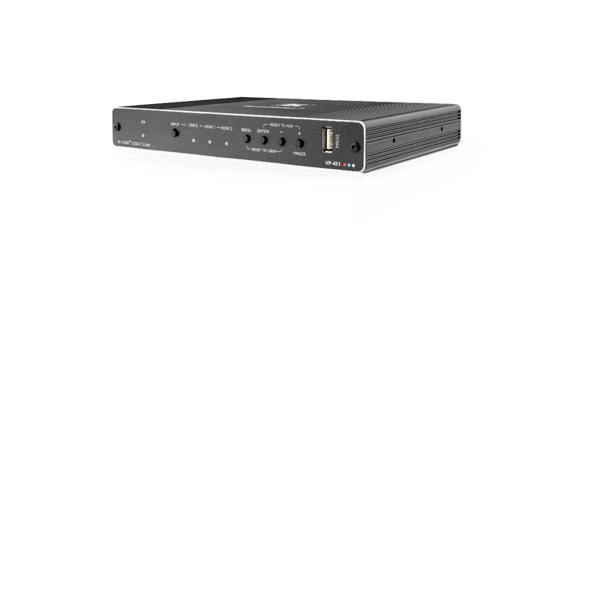 VP-451 is a high-performance 18G 4K digital scaler for HDMI and USB-C signals. The unit up-scales, down-scales, and cross-scales to resolutions up to 4K@60 (4:4:4). The output resolution can be set to automatically follow the native resolution of the sink or set manually to a custom resolution.