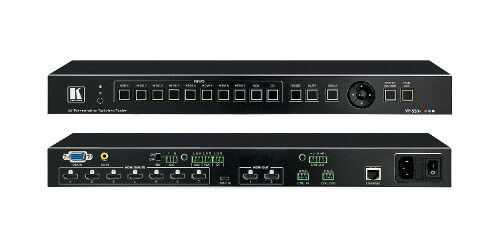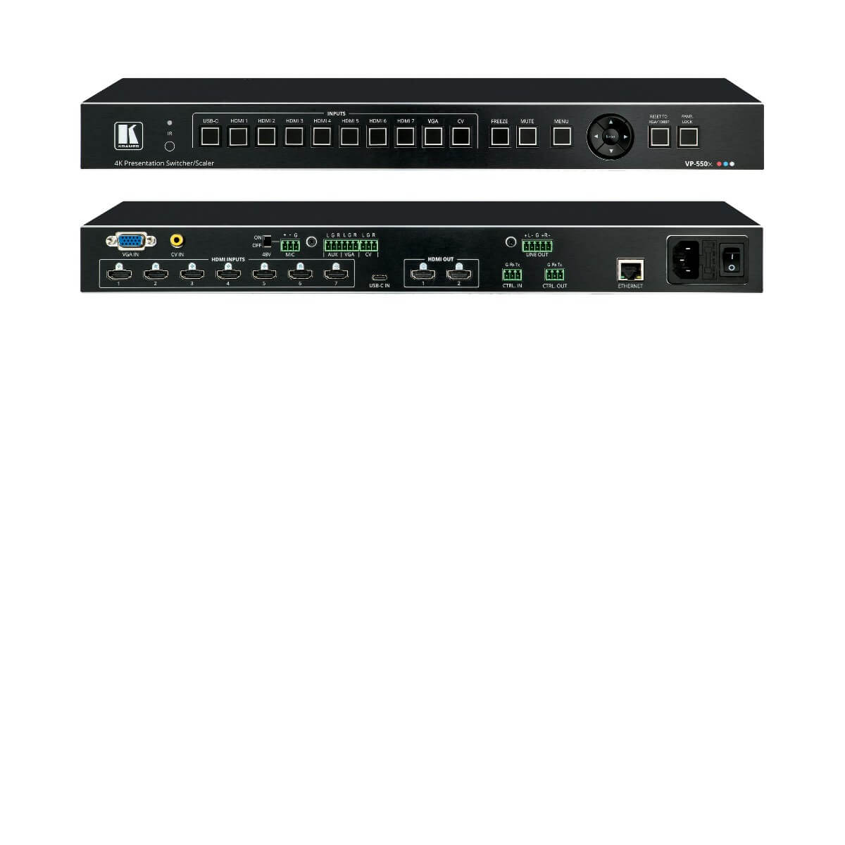 VP-550X is a versatile, professional presentation scaler/switcher for 4K@60 (4:4:4) HDMI, USB-C, VGA, and composite video signals. The unit scales the video and provides options to use the embedded digital audio or to select analog audio input signals. After processing and scaling, the embedded AV signal is sent to the 2 mirrored HDMI outputs simultaneously, and the audio is also sent to a balanced stereo audio output.