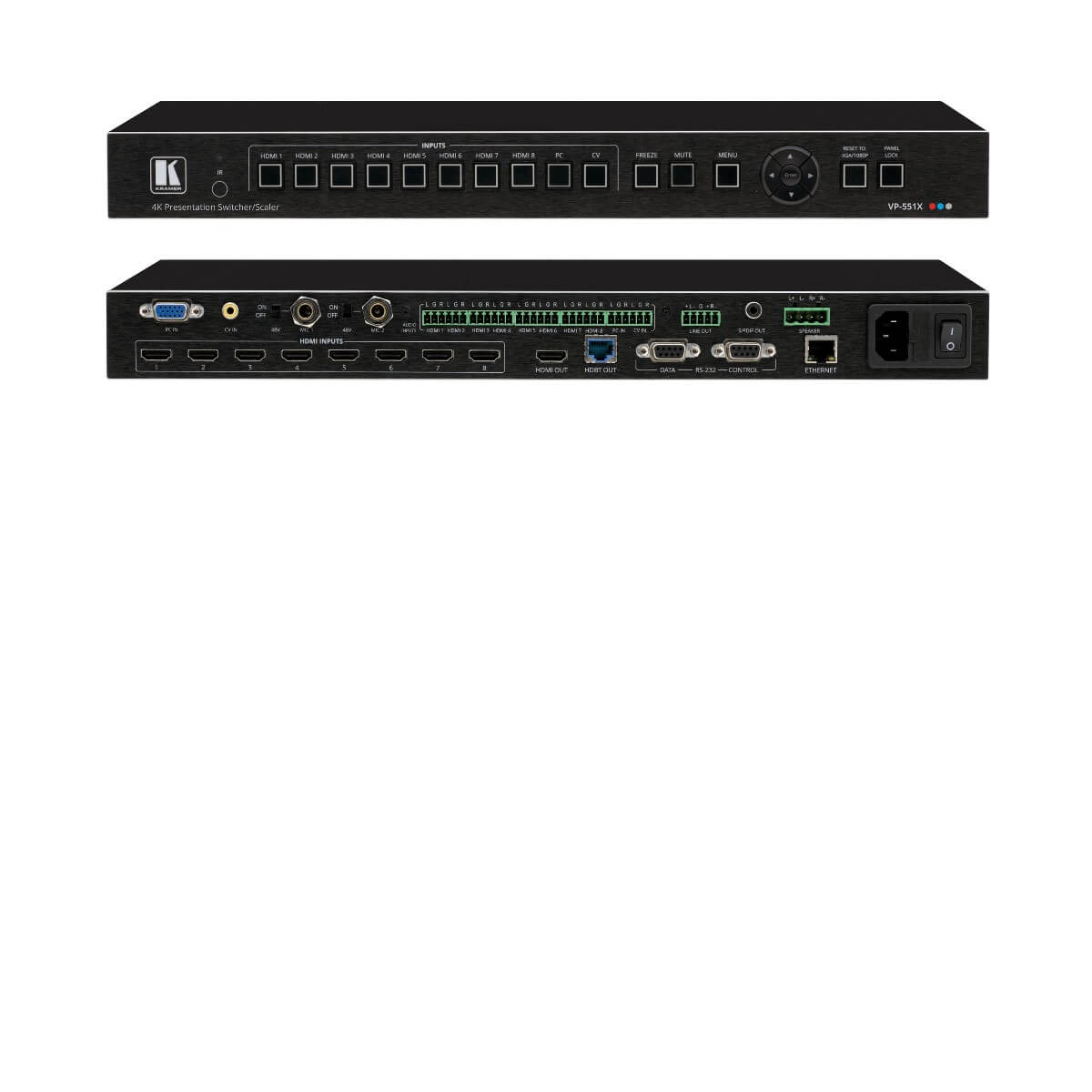 The Kramer AV VP-551X is a versatile, professional presentation scaler/switcher for 4K@60 (4:4:4) HDMI, VGA and composite video signals. The unit scales the video and provides options to use the embedded HDMI audio or to select the companion audio channel from one of ten analog audio input signals. After processing and scaling, the embedded AV signal is sent to the HDMI and the HDBaseT outputs simultaneously, and the audio is also sent to a balanced stereo audio output, S/PDIF digital output and a pair of loudspeakers.