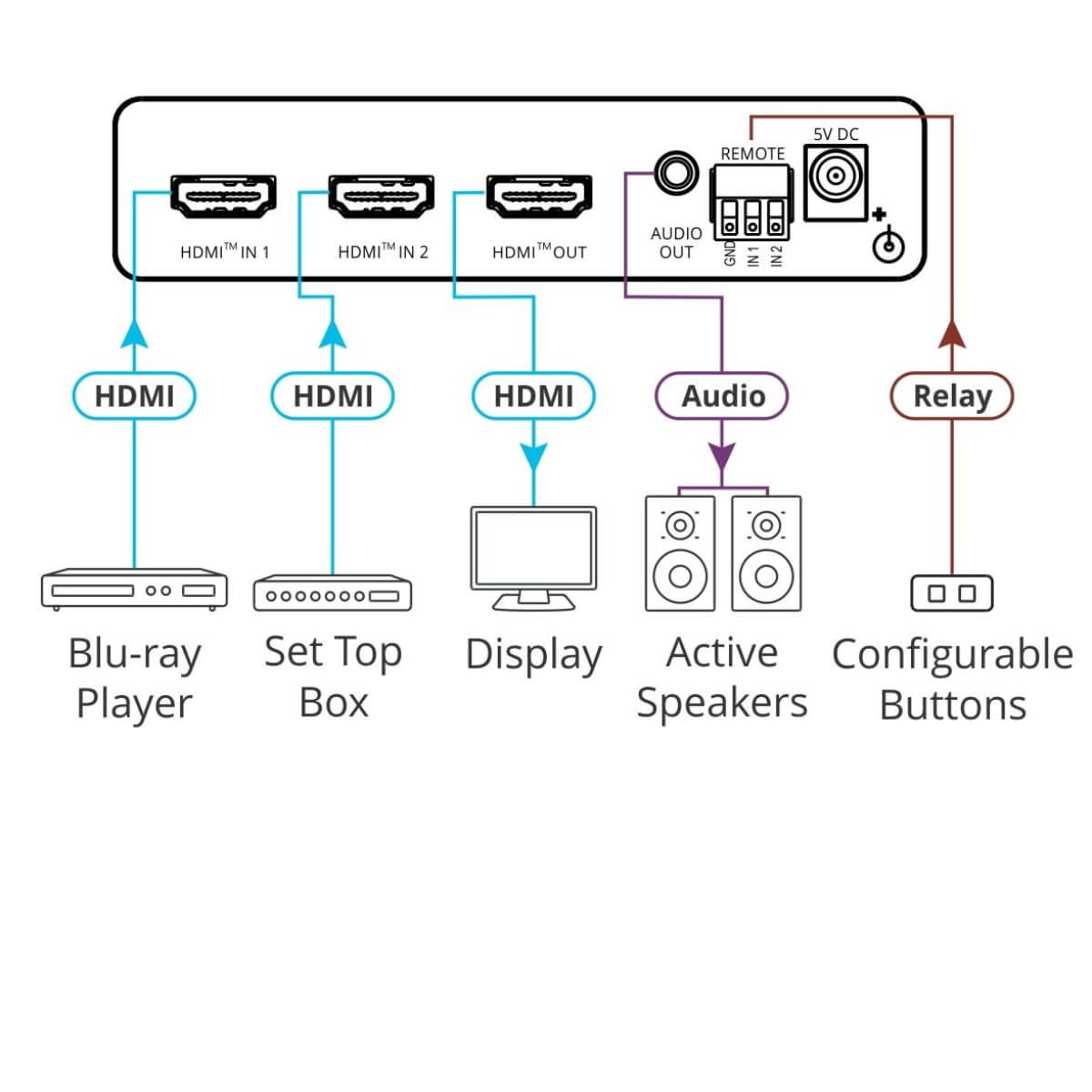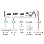 - Plug & Play Auto Switcher — Automatically plays the switched source signal on the connected display according to user–configured preferences, such as priority or last–connected input. When the user manually switches, by pressing a button, the auto switching is overridden.