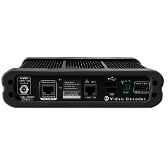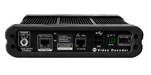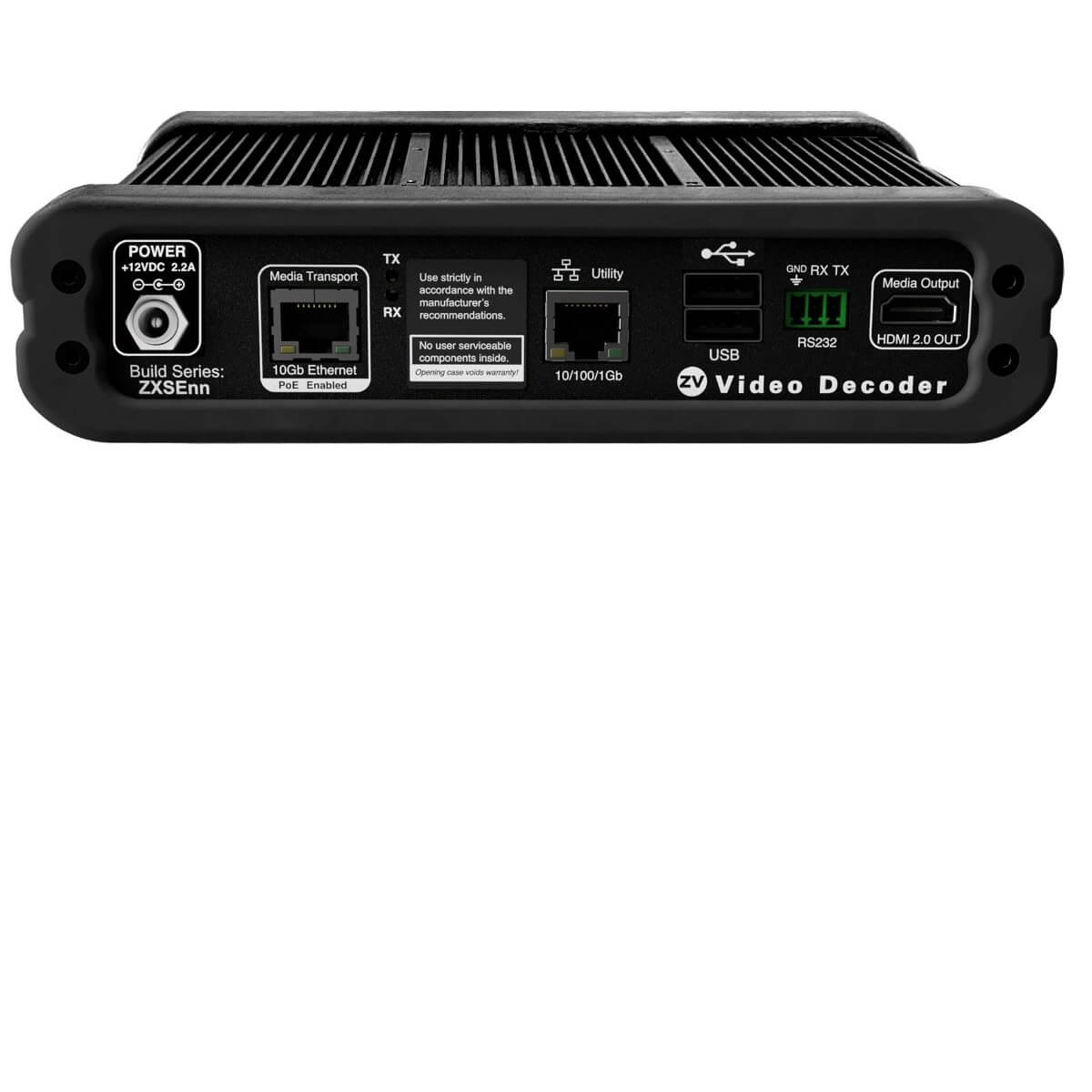 ZyPer4K-XSE Decoder, accepts IP streaming via 10Gbit/copper. PoE. Supports HDMI 2.0 and balanced analog audio output (via 5-pin phoenix). USB HID support via Dual USB-B ports. RS232 via 3-pin phoenix connector. Includes power supply. Audio/Video compatible with any ZyPer4K Encoder. Cables not included