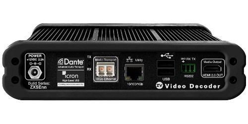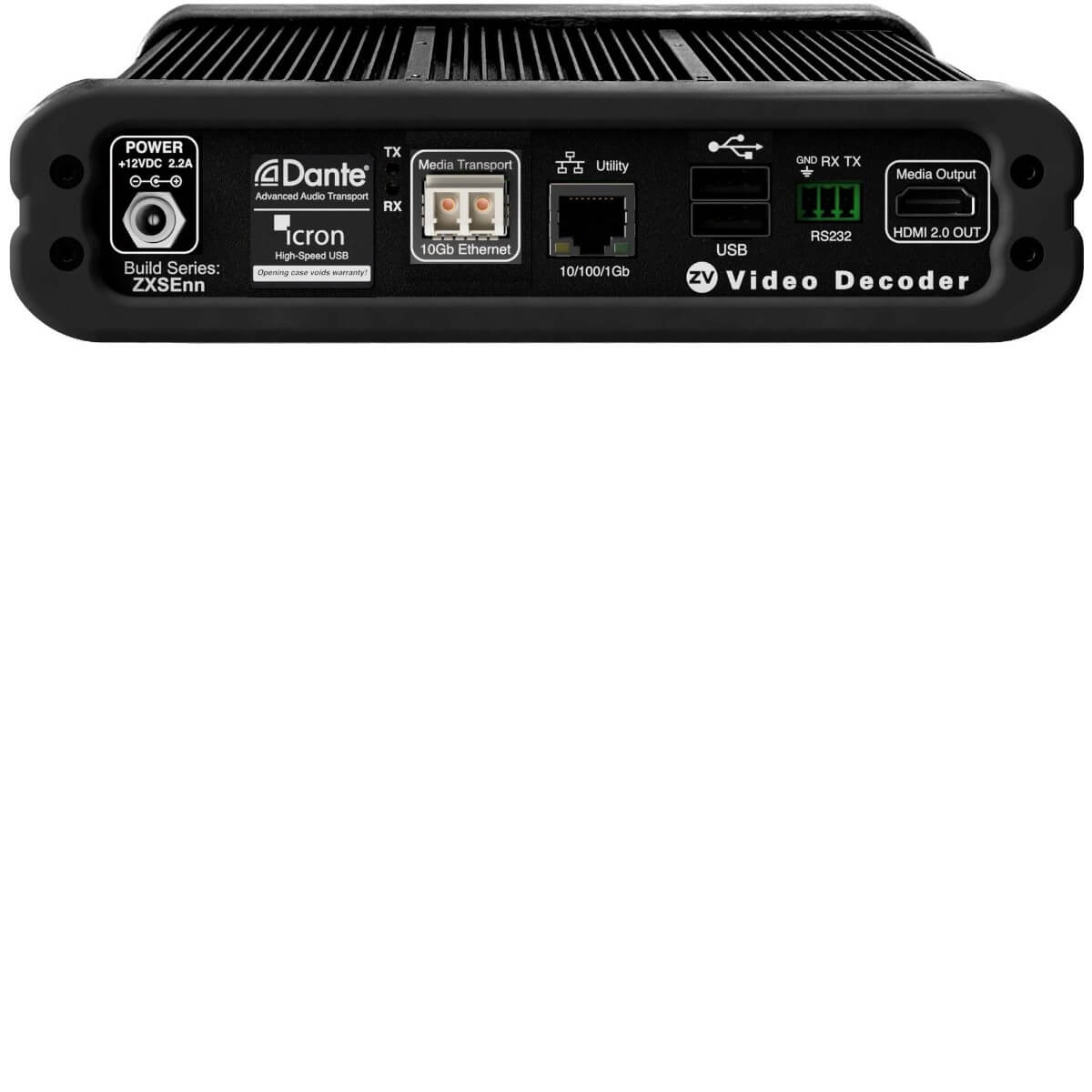 ZyPer4K-XSE Decoder, accepts IP streaming via 10Gbit/fiber with Dante support. Supports HDMI 2.0 and balanced analog audio output (via 5-pin phoenix). Full USB 2.0 support via Icron chipset on dual USB-B ports. RS232 via 3-pin phoenix connector. Includes power supply. Audio/Video compatible with any ZyPer4K Encoder. Cables not included.