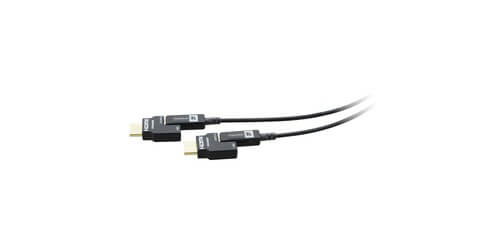 The Kramer CP-AOCH/60-33 is super high-quality Plenum Rated Active Optical HDMI Cable, that was designed to run the latest in 4K video resolutions, 4K/60 4:4:4 UHD HDMI 2.0 signals to a distance of 33' at 18Gbps. This cable features interchangeable HDMI ends that can quickly be detached during installation allowing for a much smaller profile head to pull through a conduit or other tight spaces with the included pulling capsule. DVI ends can be purchased separately. Kramer has designed these cable much thinner, lighter, and more flexible than copper or even traditional standard optical cables while still providing transparent EDID and HDCP support without signal attenuation. Equally they also provide for a reduced risk of EMI and RFI interference making them a perfect solution for use in critical AV installations that have a demand for the highest signal integrity. The CP-AOCH/60 series cables are all Plenum Rated making them perfect for running through air-returns in your ceilings, walls, and floor spaces, they are also LSHF (Low smoke & halogen free). These cables feature high-quality connectors that are made with 24K gold-plating, which are corrosion resistant and allow for the best possible connectivity. The CP-AOCH/60 Series cables come with a 7 year warranty from Kramer.
