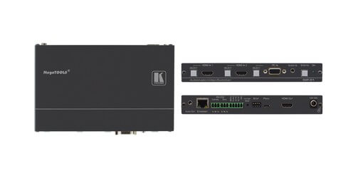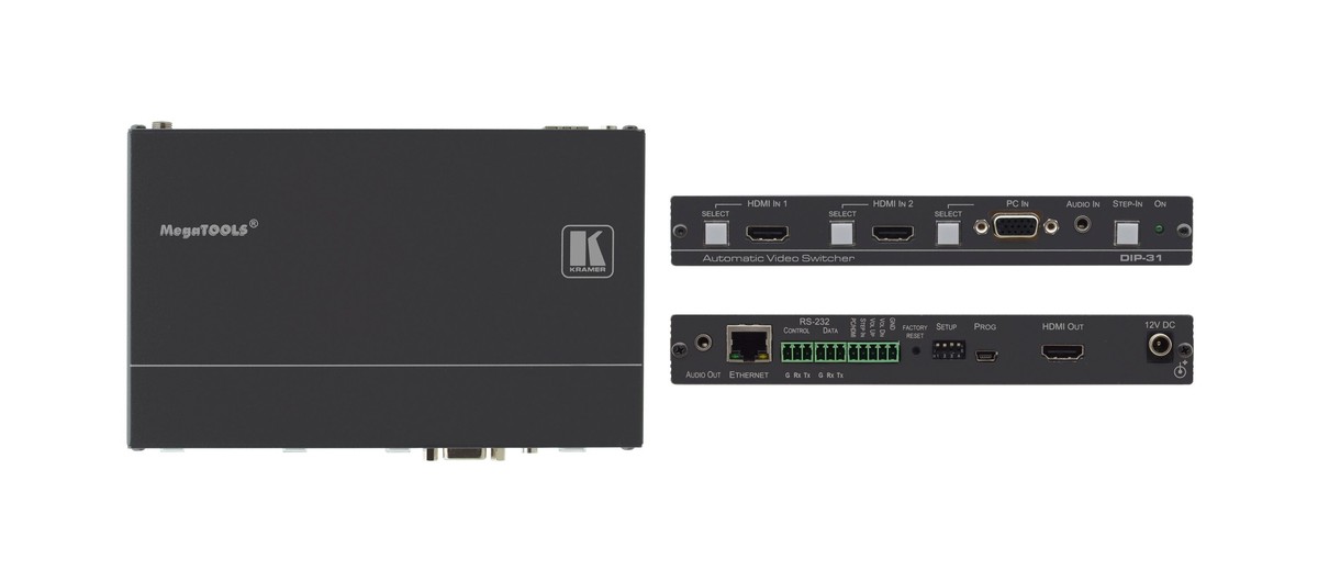 The DIP-31 from Kramer is a 4K UHD Mult-Format Auto Switcher for HDMI, VGA, Ethernet, data and unbalanced audio signals. This unit will support digital video resolutions up to 4K/60Hz (4:2:0) UHD at 10.2Gbps and various modes of input selection and transmits the signal via HDMI cable to a compatible receiver for when connection directly to a display or projector. When connected to a matrix switcher the DIP-31 is a Step-in commander that supports Step-in over HDMI such as the VS-62H (not included). It also features RS-232 commands to support monitor/projector on/off control. This unit is HDTV compatible and is HDCP compliant with sources that support HDCP repeater mode. HDMI support includes Deep Color, x.v Color and 3D. Automatic live input detection is based on video clock presence while automatic input selection is based on priority selection or last connected input, there is also manual input selection for further flexibility and control. The DIP-31 offers convenient control via Kramer Protocol 3000 and embedded Web pages over LAN or via RS-232 command support. The I-EDID Pro Kramer Intelligent EDID Processing is built-in and is a intelligent EDID handling & processing algorithm that ensures Plug and Play operation for HDMI systems.