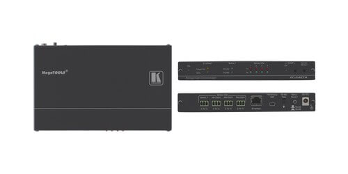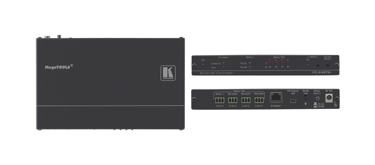 The Kramer FC-24ETH is a bidirectional RS-232 or RS-485 to Ethernet control signal converter. It allows four RS-232 (or one RS-485 and three RS-232) controllable devices to be controlled via an Ethernet or LAN connection.