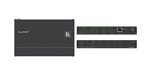 The Kramer FC-28 is an ideal companion to K-Touch control by receiving K-Touch Ethernet-based per-I/O port commands and converting them into I/O interface signals on the requested I/O port. Responses are sent back to all Ethernet connected panels
