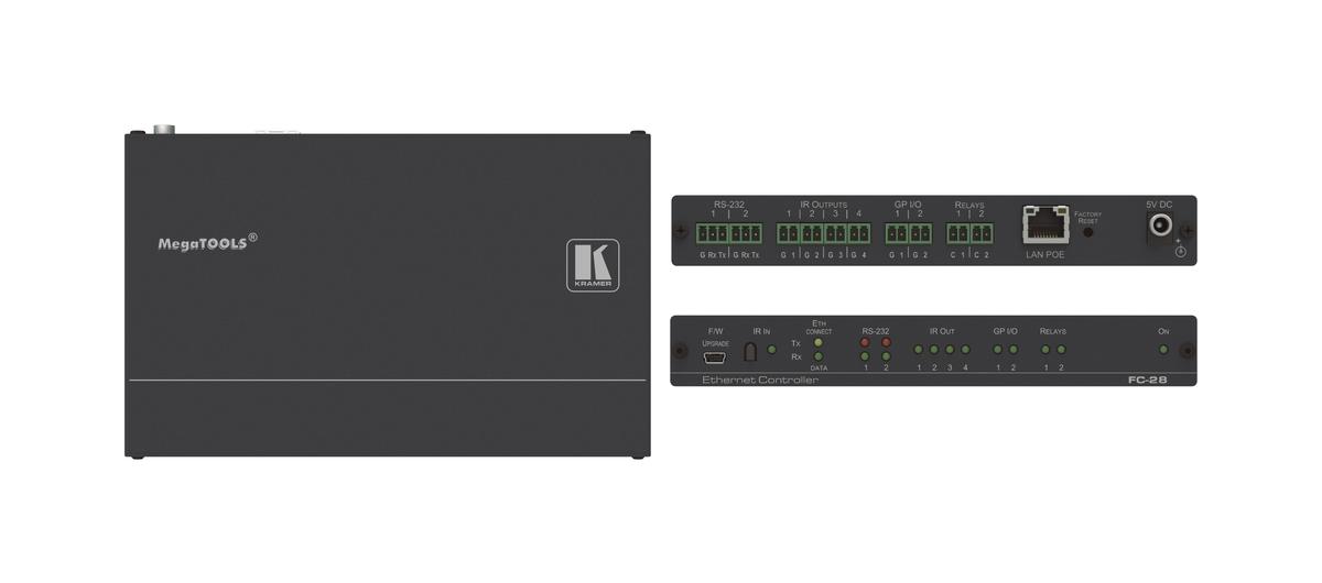 The Kramer The FC−28 is a bidirectional RS-232, IR control, GPI/O, and relay control signal converter to Ethernet. Two RS-232, four IR, two GPI/O, and two relay controllable devices can be controlled via an Ethernet or LAN connection. These Ethernet to I/O controllers bridge the gap between Ethernet infrastructures and I/O communication devices by offering bidirectional Ethernet to any I/O interface conversion. All setup and maintenance of the devices is done from built-in Web pages which are accessible using any common Web browser.