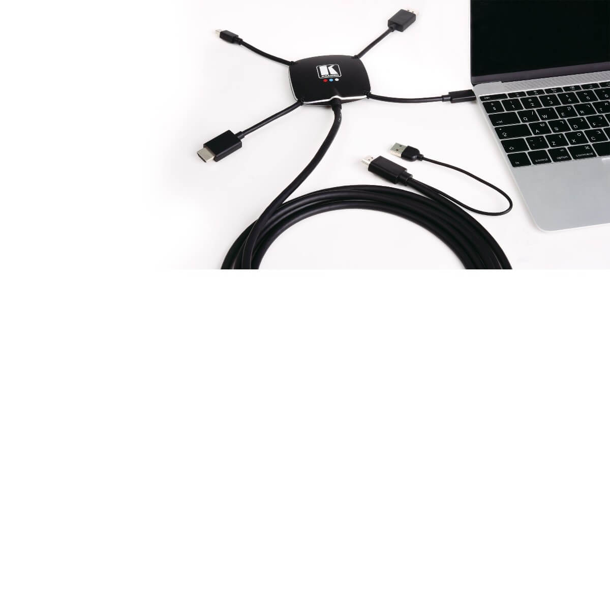 The Kramer Electronics K−SPIDER, is an active multi−format male input to HDMI male output adapter that enables you to connect one HDMI, DisplayPort, mini DisplayPort, or USB Type−C source to an HDMI acceptor.