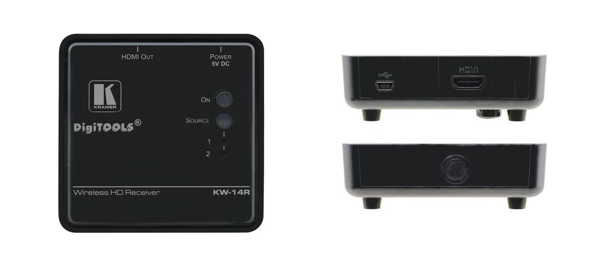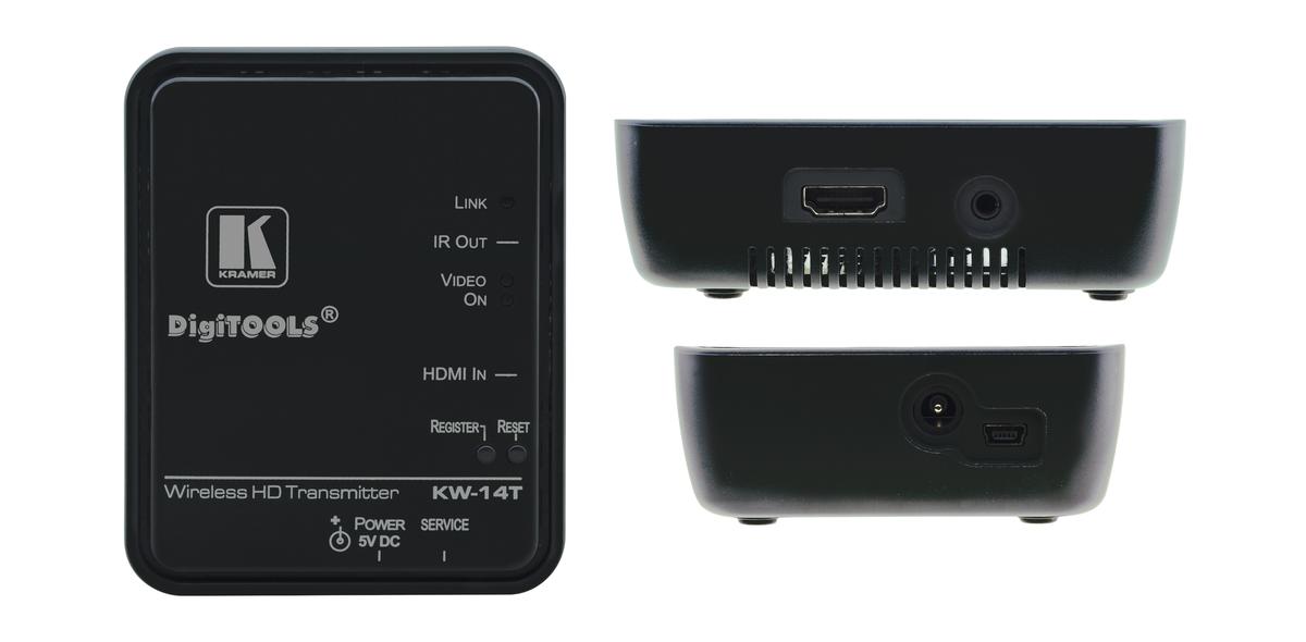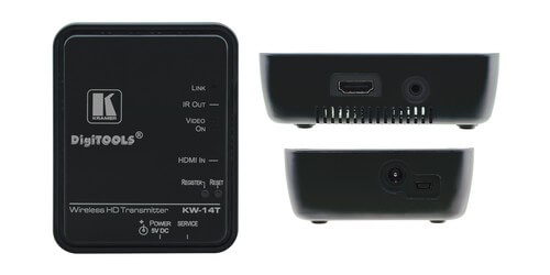 The Kramer KW-14 is a wireless transmitter and receiver kit that will wirelessly send your HDMI signal with no cables and no latency. The transmitter can send the signal with no wires up to 100' away to the receiver, it can even send this through normal walls. This is an ideal scenario when running an HDMI cable is too difficult, cumbersome, or costs to much in time and labor. The indicator lights indicate when the devices are connected to a source and a display and when video has been detected between the receiver and transmitter. The transmitter automatically selects the best available RF frequency so you don't have to worry about interference. 128 bit AES encryption ensures that your signal remains secure. Up to 3 more KW-14R receivers can be purchased to work off the 1 transmitter Alternatively you can purchase up to 2 more KW-14T transmitters to switch with the included IR remote to the receiver.