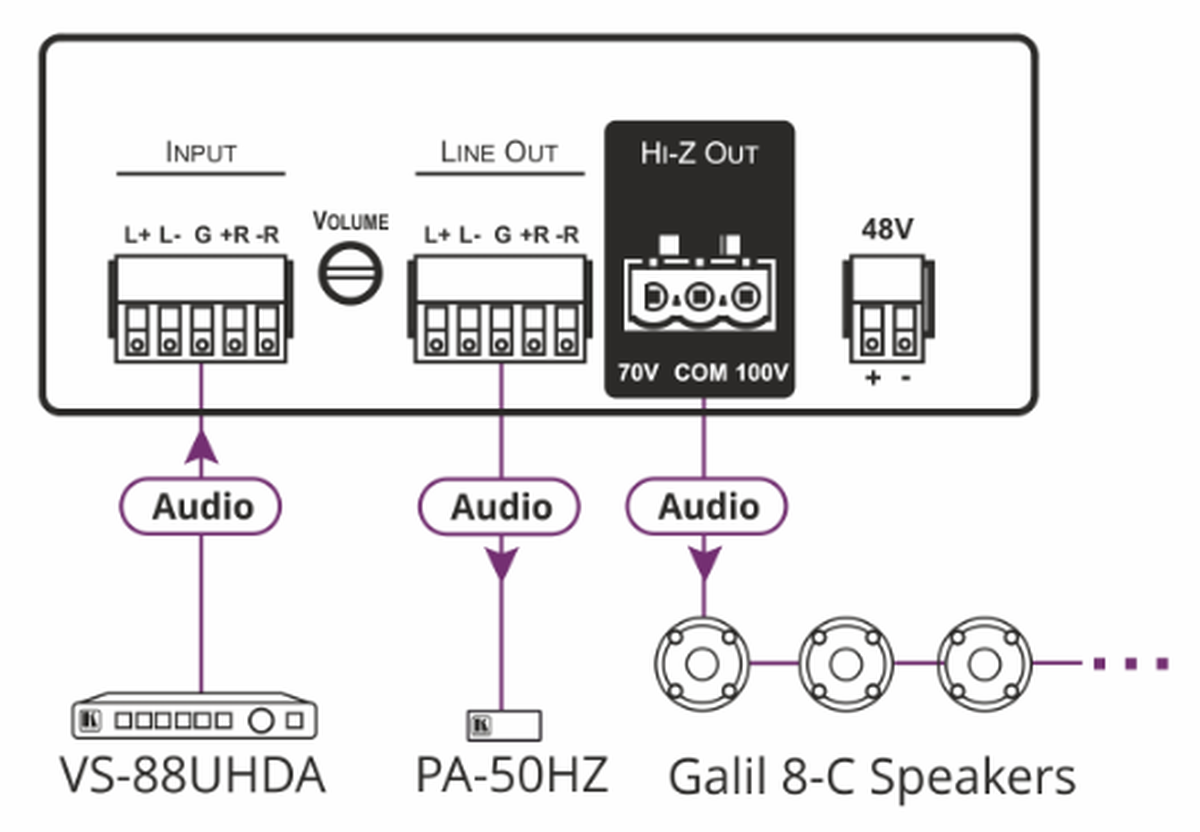 Kramer's PA-50HZ (PA-50Z) is a compact Hi-Z (70V/100V) power amplifier with line-level output.