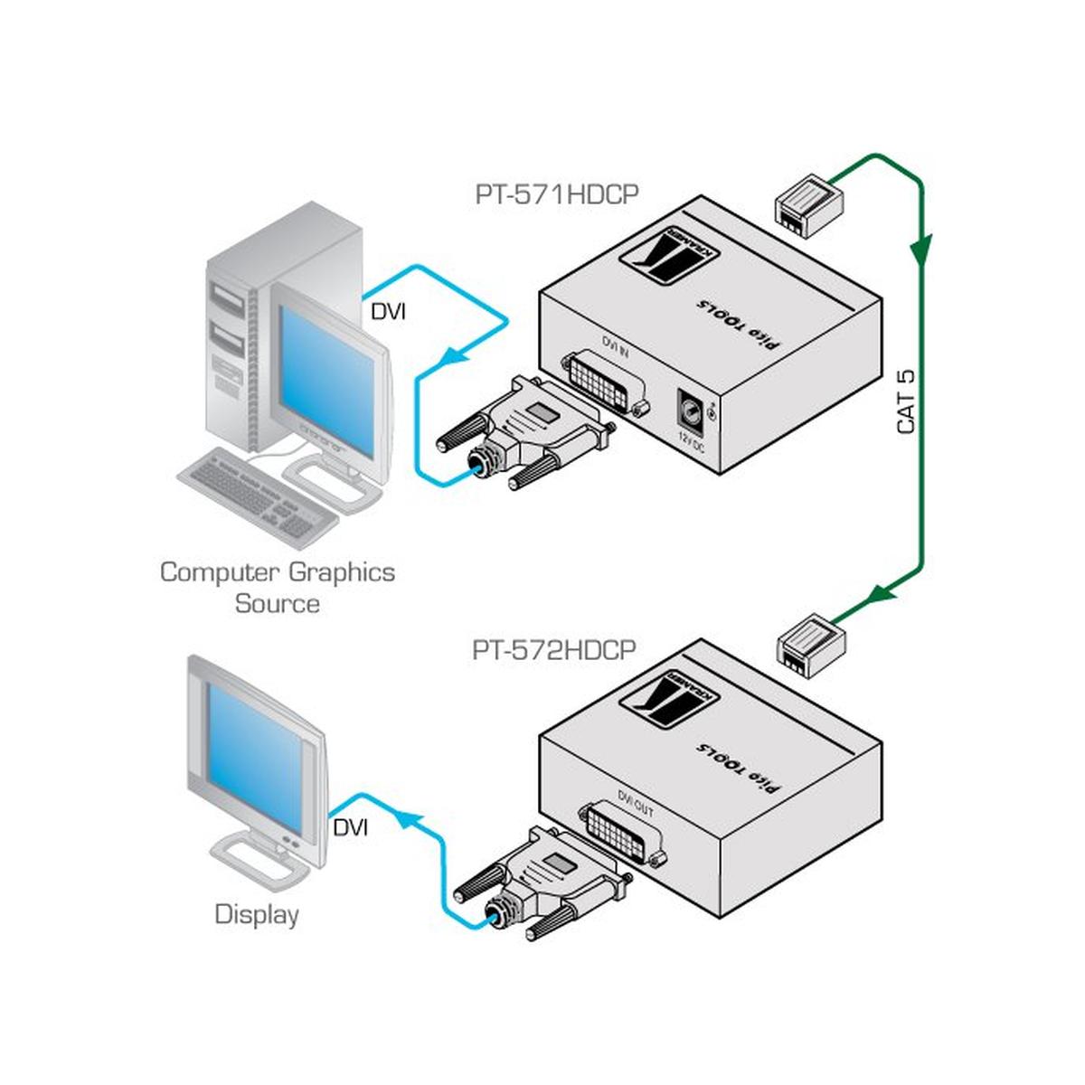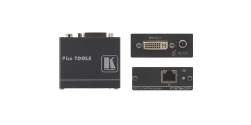 Kramer's PT-572HDCP+ is a high-performance DGKat twisted-pair receiver for DVI signals. This device works with the PT-571HDCP when it converts the DVI to twisted pair signal and then the PT-572HDCP+ converts the twisted pair signal back to a DVI signal. This is both HDTV compatible and HDCP compliant and has a maximum data rate of 4.95Gbps(1.65 per graphics channel). This type of twisted pair receiver is a great solution in board, conference, and training rooms, it is also a great addition to presentation systems, signal distribution and home theater type applications. Another great feature for the PT-572HDCP+ receiver is EDID PassThru which pass EDID signals between the source and display, and a power connect system option, that makes it so a single connection to either the transmitter or receiver can power both units when they are within 150' of each other, for signal transmissions longer than 150' an external power adapter will be required.