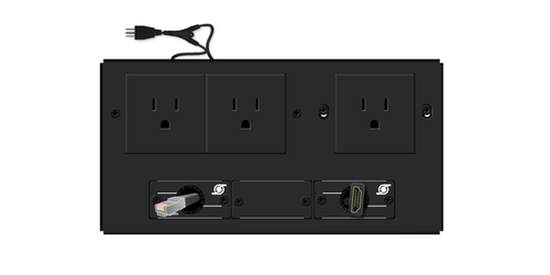- Includes: (3) power with one 6' cable, (1) 5.9' retractable HDMI, (1) 5.9' retractable RJ45 (Data), (1) Blank Plate