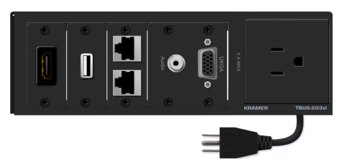The Kramer TBUS-203XL-KIT1 is a pop up box in black or silver finish, it ships with 1 power with 6' cord, 1 VGA, 1 audio, 2 RJ45, 1 passive USB-A, and 1 HDMI. All the connections are female to female so they are easy to connect to. The box mounts flush in your table and when pressed pops up out of the table via a gas spring, when you are done just close it till it latches shut. The cutout dimension needed is 8.4" x 4.8" and will work in any table up to 3" thick, just cut your hole with the included cutout template and drop the box in and you are done.