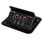 The Kramer TBUS-203XL(B) is a modular pop up box in black finish, it is empty so you can populate the connections exactly how you need them now and also change them as needed in the future. There is room for 1 power socket and space for five single plates or two dual plates and one single plate. The box mounts flush in your table and when pressed pops up out of the table via a gas spring, when you are done just close it till it latches shut. The cutout dimension needed is 8.4" x 4.8" and will work in any table up to 3" thick, just cut your hole with the included cutout template and drop the box in and you are done.