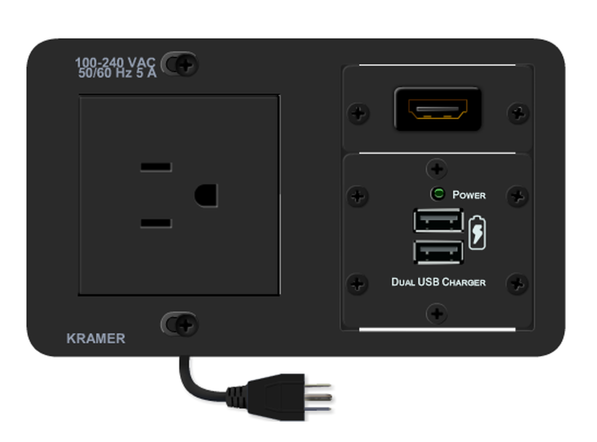 The Kramer TBUS-5xl-KIT4 is a configured table box with a manually retractable lid. The lid lifts up then slides down and out of the way, the lid also has a small opening in it so cables can be plugged in with the lid closed. This table box features dual USB charging ports, the ports are 2A each so they can handle up to charging 2 tablets simultaneously.