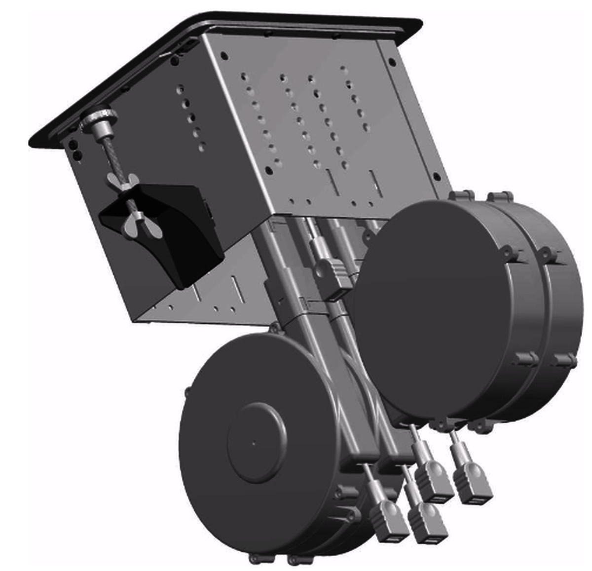 The Kramer TBUS-5xl-KIT5 is a table box with power and retractable cables. Retractable cables ensure that you always have the correct cable for your presentation while keeping your table nice and tidy. The lid lifts up then slides down and out of the way, the lid also has a small opening in it so cables can be plugged in with the lid closed.