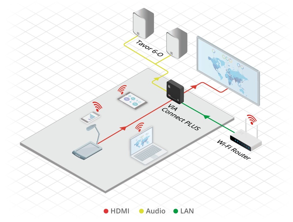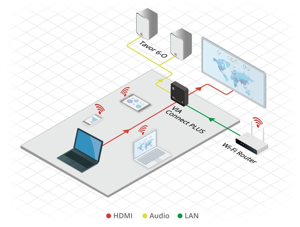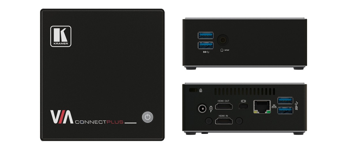 The VIA-Connect-PLUS by Kramer Electronics is the latest edition to the already popular VIA Group Collaboration and Wireless Presentation Solution Systems. The VIA-Connect-PLUS features all the great benefits of the Connect PRO, but with the added addition of an HDMI input. This provides users the ability to have both simultaneous wired and wireless presentation gateway without the need for additional hardware. Now, with any laptop or mobile device, participants can display or stream uninterrupted Full HD Video (1080p@60Hz), images, documents, or share files of any size instantly to your display. This unit will allow for up to 4 users to appear on the display at the same time.
