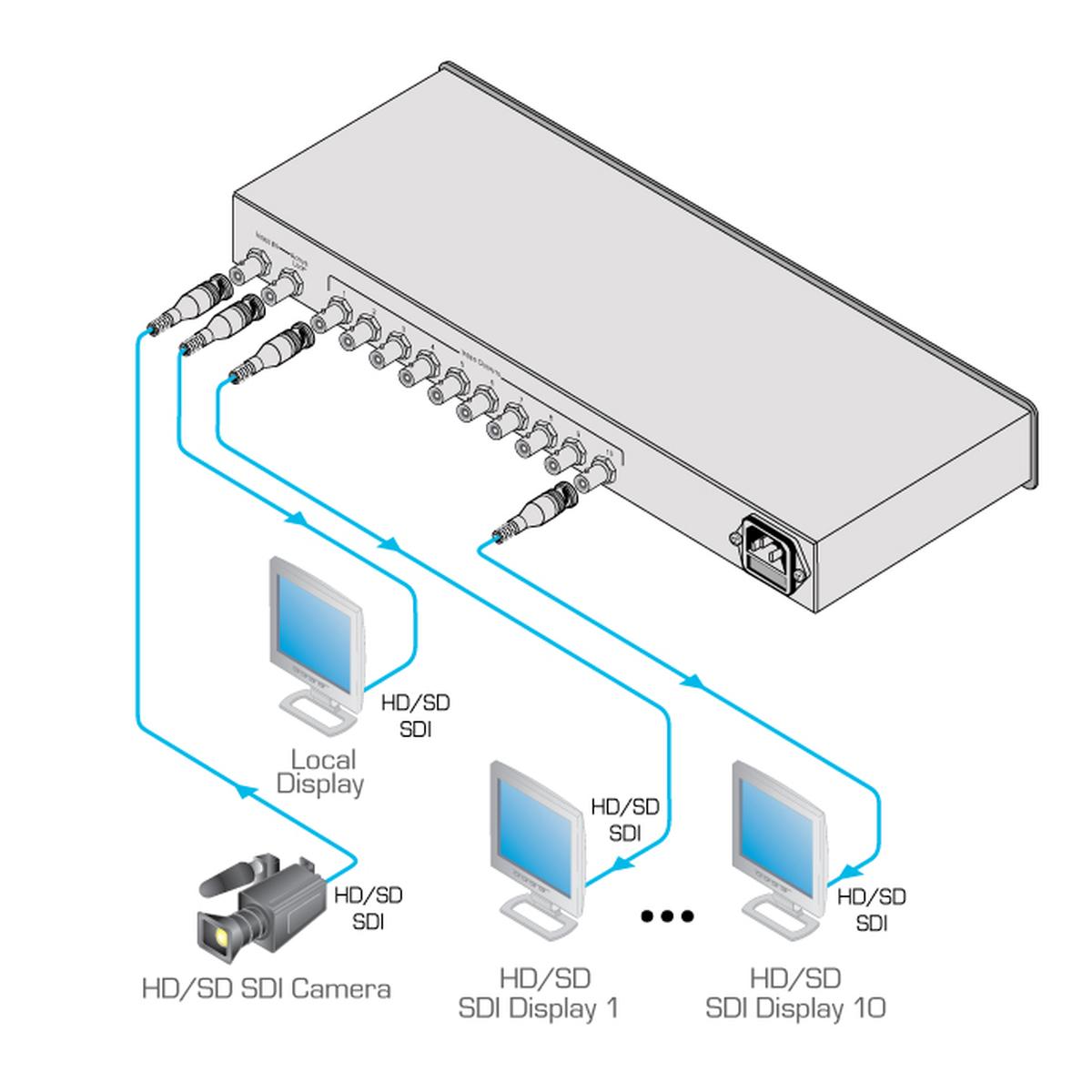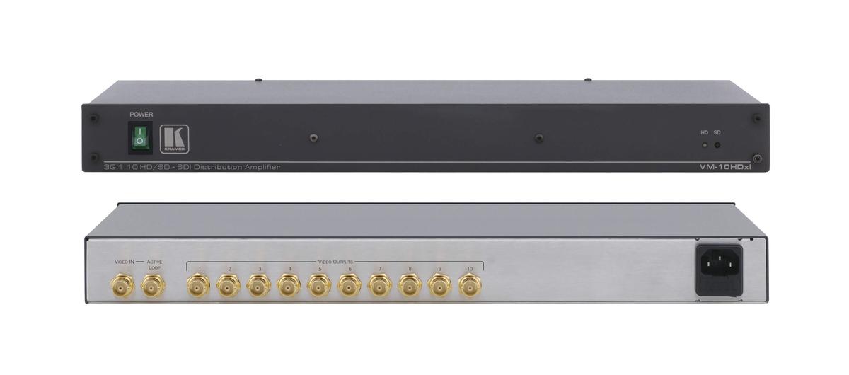 The VM-10HDxl from Kramer is a high-performance distribution amplifier for 3G HD-SDI signals. The amplifier will take one input, provide the correct reclocking and equalization, then distributes the signal to ten identical outputs. This is ideal in SDI production studios for signal distribution and equalization, as well for use in broadcast studios for On-Air operation & SDI field production.