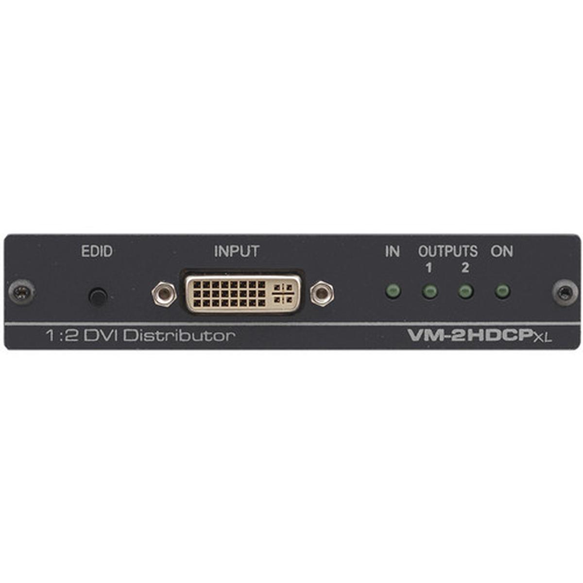 The VM-2HDCPxl from Kramer is a distribution amplifier with 1 input and 2 outputs for DVI-D signals with resolutions up to and including WUXGA and 1080p. This device is great for use in multiple screen applications where you have the need for sending DVI signals from a computer graphics source to a display or projector on the receiving end. It is also HDCP compliant for data copy protection. The DVI distribution amplifier works by reclocking and equalizing the DVI signal and then distributing it to two identical outputs. This high-end device features a fast maximum data rate of 6.75Gbps, a resolution up to WUXGA and 1080p, is HDTV compatible and uses active input and output LED indicators. Other features include Kramer's equalization & "re-Klocking" technology which rebuilds the digital signal to travel longer distances, and its intelligent EDID processing ability, which uses a handling and processing algorithm that ensures plug and play operation for DVI systems.