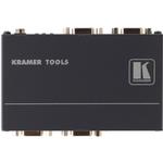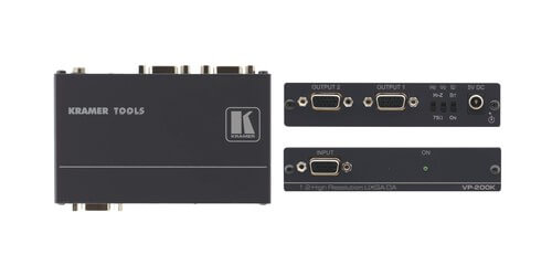 The VP-200K from Kramer is a 1x2 computer graphics distribution amplifier that has resolutions up to an exceeding UXGA. This device features Kramer's Kr-isp Advanced Sync Processing which ensures compatibility with a wide range of computers (even if the sync level is too low) by restoring the sync the signal waveform. The Kr-isp feature can equally be enabled or disabled. The distribution amplifier works by taking one input, provides the correct buffering and isolation, then distributes the signal to two identical outputs on high-density 15-pin HD connectors. Ideal applications for use are in dual monitor systems, stores, point of sales, and in high-performance presentation systems, where you have one computer graphics source and need to send an identical signal to multiple displays or a monitor, pojector, and a display for example. Features for the VP-200K include a high-bandwidth of 400MHz to ensure transparency even at high-resolutions, HDTV compatible, ID Bit Control, and EDID PassThru which passes EDID signal from display to source via output. The VP-200K also has DDC (Display Data Channel) communication support between the input and output 1 high-density 15-pin HD connectors on pins 11, 12 and 15, and has a selectable sync input impedance.