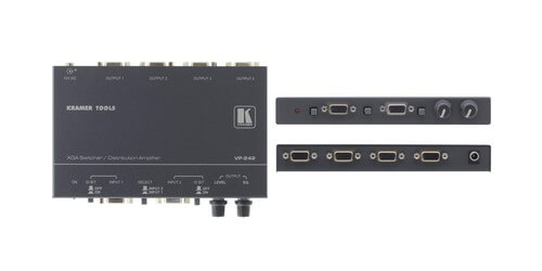 Features of the VP-242 include: HDTV compatibility, ID BIT control for both inputs, Level and EQ rotary controls for the outputs, and a high video bandwidth that exceeds 400MHz to ensure transparent operation in all graphics and presentation applications. In addition the VP-242 XGA Switcher / Distribution Amplifier is housed in an enlarged Kramer TOOLS enclosure, its width is that of a desktop PC cover, thus occupying very little space in your rack space. This product comes with its own power supply and is backed by a 7 year warranty from Kramer.