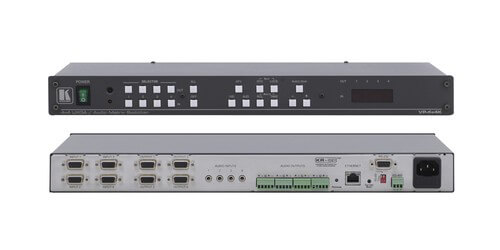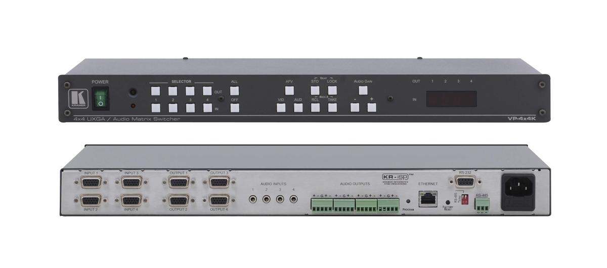 The VP-4x4K from Kramer is a high-quality matrix switcher for computer graphics video signals, with resolutions that exceed UXGA, and balanced stereo audio signals. This device has the ability to route any or all of the inputs to any or all of the outputs simultaneously. It is HDTV compatible and has a high bandwidth of 400MHz. Kramer's Kr-isp Advanced Sync Processing ensures compatibility with a wide range of computers (even if sync level is too low) by restoring the sync signal waveform. The ideal uses for the VP-4x4K are in professional display systems requiring true 4x4 matrix operation, and is also great in multimedia/presentation source and acceptor selection applications. You also however, can use this device in remote monitoring of computer activity in schools and business, where security and content protection is needed.
