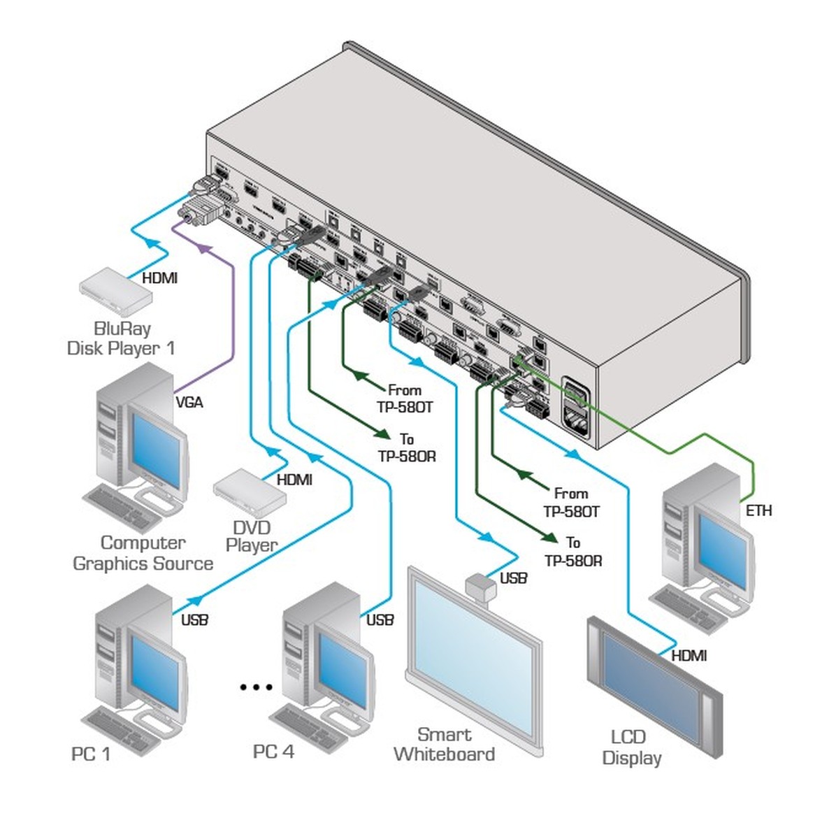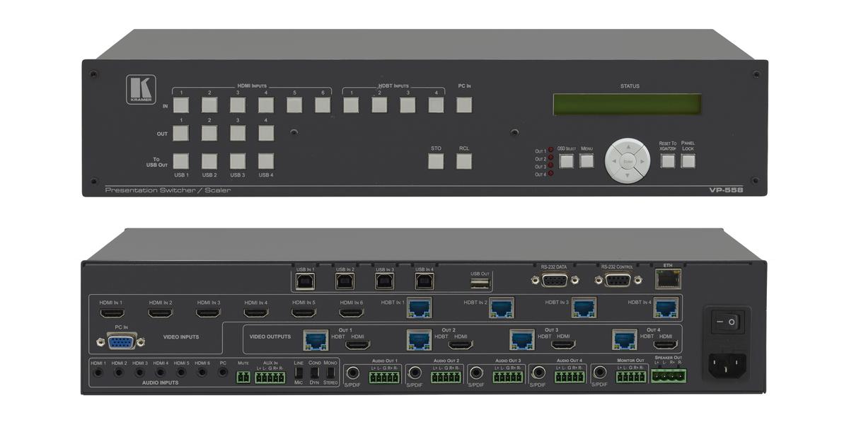 The Kramer VP-558 is a multi-format presentation switcher and scaler, as well as a 11x4 matrix switcher. The inputs include 6 HDMI inputs, 4 HDBaseT inputs, 1 VGA input, and an integrated 4x1 USB switcher. There are 4 independent 1080P scaled outputs, each output includes an HDBaseT connection or an HDMI connection. Choose HDMI out for close sources, or the HDBaseT out to send your signal over a single Cat6 connection up to 230' away to a compatible receiver.