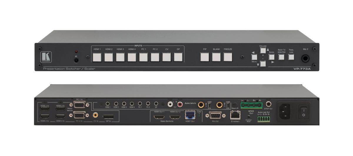 The Kramer VP-773A is an 8 input and 3 output multi-format presentation switcher with scaled outputs. The switcher features 4 HDMI, 2 VGA, 1 DisplayPort, and 1 composite input connections. The outputs are simultaneous 2 HDMI and 1 HDBaseT that can be scaled up to 2K. The ProScale integrated scaler also offers high quality video processing for high grade de-interlacing, noise reduction, and 3D comb filtering. Other video adjustments are color, hue, sharpness, contrast, and brightness and gamma that are set individually for each input.