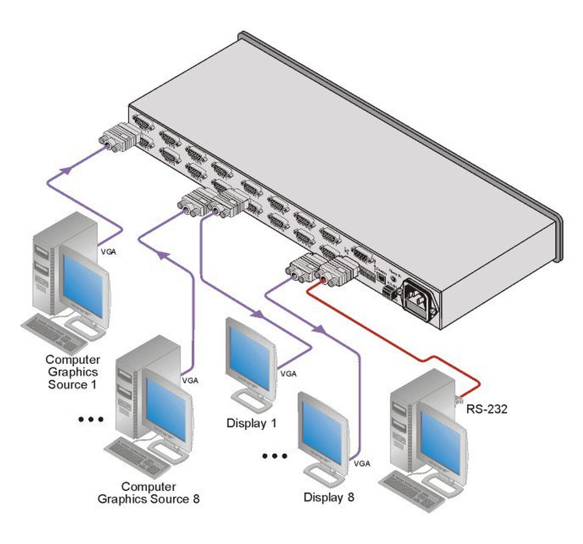 With flexible control options through the front panel, RS-485, RS-232 (K-Router Windows-based software is included) Ethernet, or the included IR remote control, the VP-8x8 can handle all you computer graphic and audio switching needs for smaller professional display systems. This product comes backed by Kramer's 7 Year warranty.