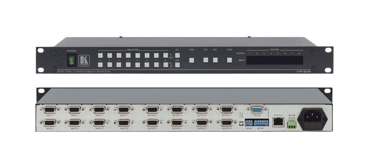 With the VP-8x8 being a true 8x8 matrix it contains 8 VGA inputs, and 8 VGA outputs all on 15-pin HD connectors. Other features of the VP-8x8 include delayed switching which is available up to a 3.5s (user selectable) delay for seamless switching when switching between non-genlocked sources. A "take button" can execute multiple switches at the same time, and memory locations can store multiple switches as presets to be recalled and executed as needed. This device also has a front-panel control lockout feature to prevent unwanted tampering. Additionally there is a active input indication reporting feature where each input button on the front panel automatically lights up when the unit detects a video signal on that input, or when an input is selected for switching, the button changes to a different color to indicate it is the active input.