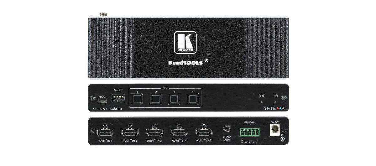 The Kramer Electronics VS-411X is a high resolution, compact, 4x1 HDMI Auto Switcher that features 4K60 4:4:4 resolutions with HDCP 2.2 compliance. This unit offers priority and last−connected switching options, it automatically switches according to the selected switching scheme based on active video signal detection.
