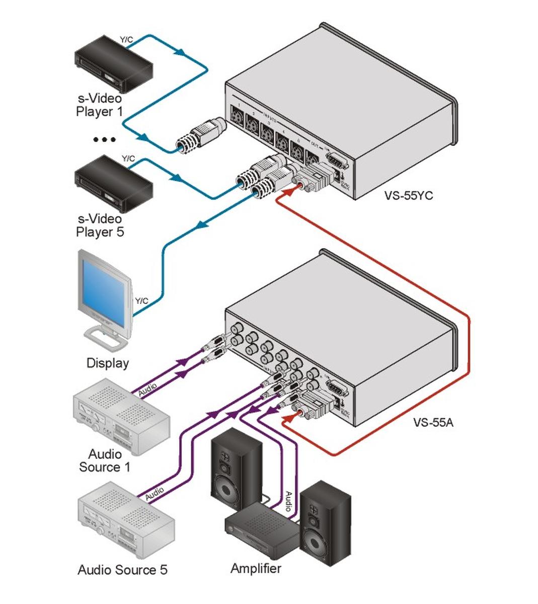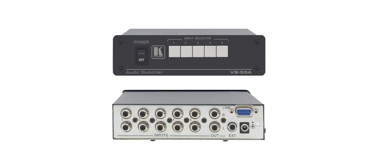 The VS-55A by Kramer is a high-performance 5x1 Switcher for unbalanced stereo audio signals. It has the ability to switch any one of the 5 signals to a single output. This is an ideal product for use in: Retail Stores, Restaurants, Sports Bars, Video and Production Studios, and in any professional display system requiring premium quality audio switching. With 5 unbalanced stereo audio inputs on RCA connectors, and 1 unbalanced stereo audio output on RCA connector, this matrix has a max bandwidth at 100kHz, and is controlled through the 5 button front panel, or contact closure via the link connector.