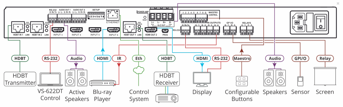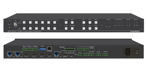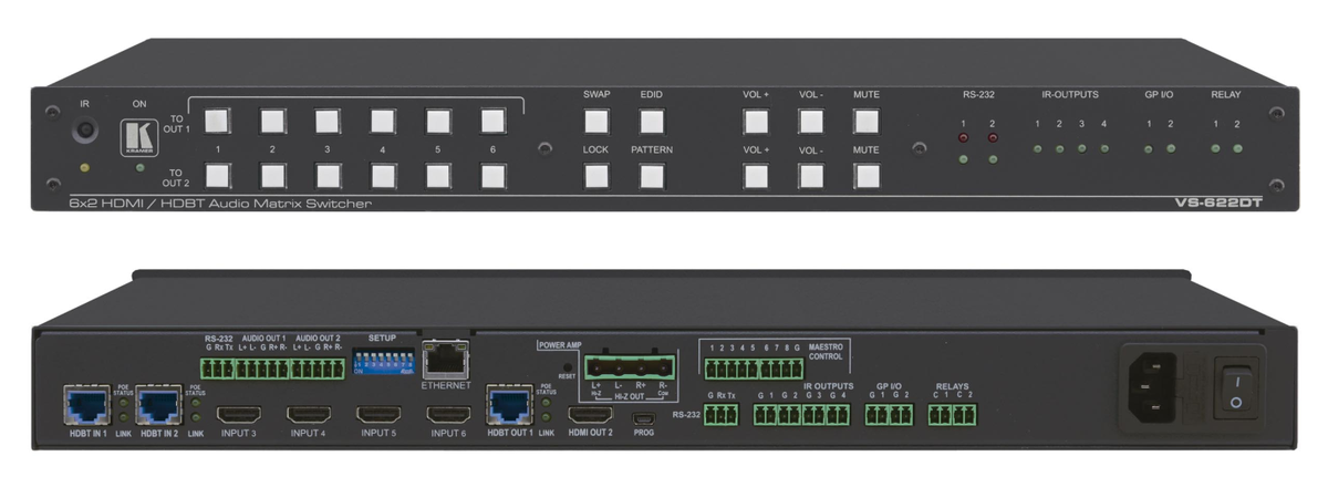 Kramer's VS-622DT is an all-in-one 4K@60Hz (4:2:0) presentation system featuring 6x2 HDMI/HDBaseT matrix switching, control gateway, PoE, power amplifier, and Maestro room automation. The unit re-clocks and equalizes signals and routes any input to the HDMI or the HDBaseT output or to both outputs simultaneously. It supports resolutions up to 4K@60Hz (4:2:0) and WUXGA.