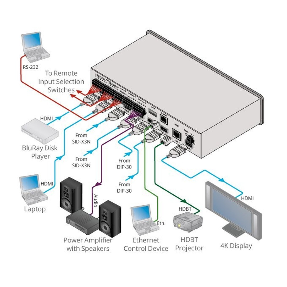 - Control: Front panel buttons, IR remote (included), RS232, Ethernet, contact closure, embedded Web server and stepin