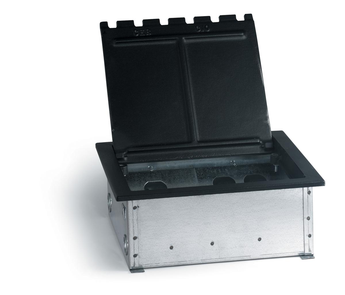 The Lew Electric CF10C8K is a floor box designed specifically for concrete pour applications. Included is a heavy duty cast aluminum black lid, when closed there are 6 gaps for cables to pass through while they are still connected inside the box.
