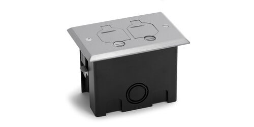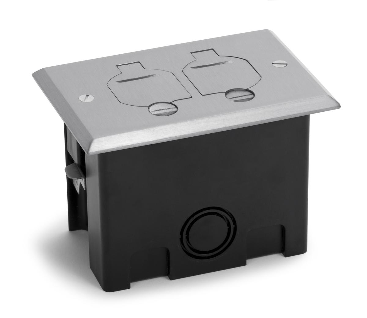 The Lew Electric PB1-FPA is a single gang plastic power floor box with an aluminum cover. Inside the floor box is a duplex 15A power outlet, the rectangular box has an interior capacity of 22.5 cubic inches (minus the outlet). The box is made of a lightweight yet durable polymer construction with adjustable wing clamps for added installation support. The box is very easy to install and extremely affordable compared to a traditional metal floor box. The cover is aluminum and features two flip lids for quick access to your power.