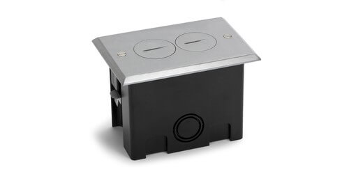 The Lew Electric PB1-SPA is a single gang plastic power floor box with an aluminum cover. Inside the floor box is a duplex 15A power outlet, the rectangular box has an interior capacity of 22.5 cubic inches (minus the outlet). The box is made of a lightweight yet durable polymer construction with adjustable wing clamps for added installation support. The box is very easy to install and extremely affordable compared to a traditional metal floor box. The cover is aluminum and features two screw plugs for secure access to your power.