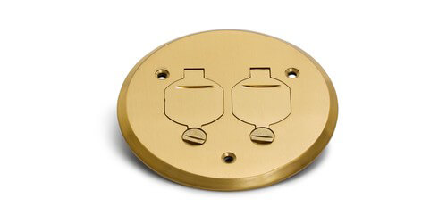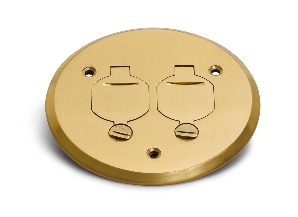 The Lew Electric PBR-FPB is a round brass cover designed to be used with the optionally purchased PBR-1 plastic floor box . The cover is brass and features two flip lids for quick access to your power.