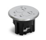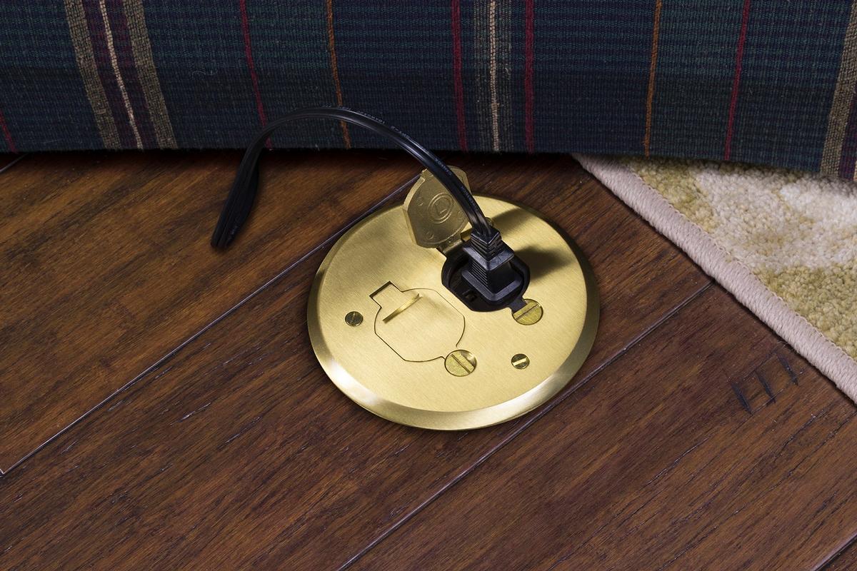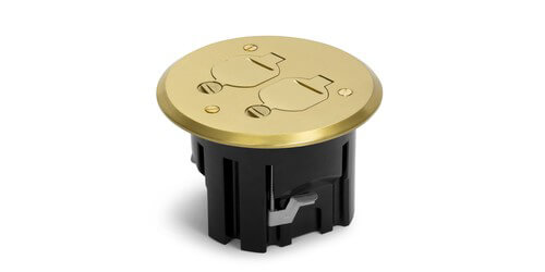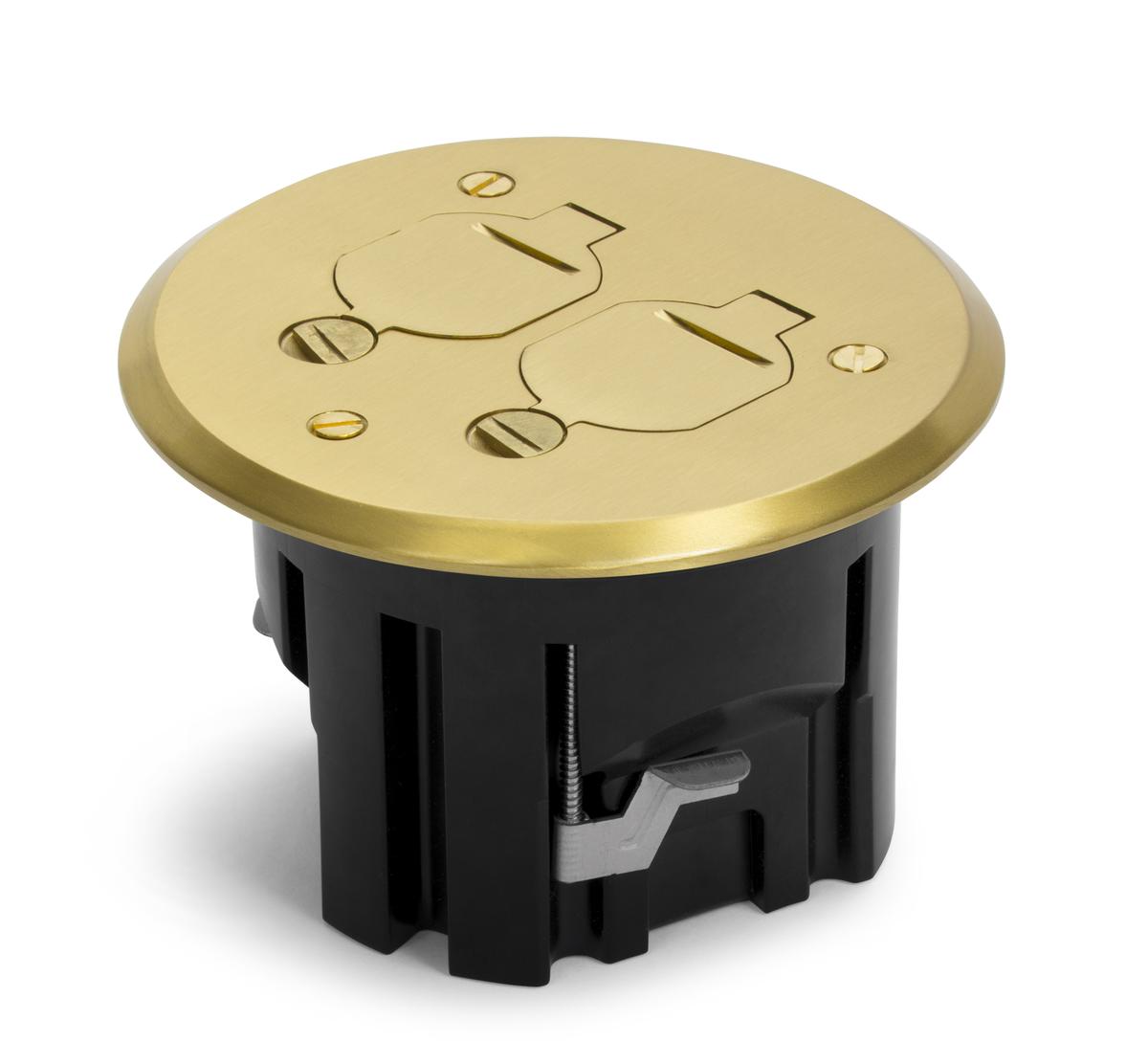 The Lew Electric PBR1-FPB is a round plastic power floor box with a brass cover. Inside the floor box is a duplex 15A power outlet, the round box has an interior capacity of 20 cubic inches (minus the outlet). The box is made of a lightweight yet durable polymer construction with adjustable wing clamps for added installation support. The box is very easy to install and extremely affordable compared to a traditional metal floor box. The cover is brass and features flip up plug lids for quick access to your power.