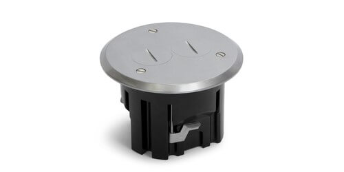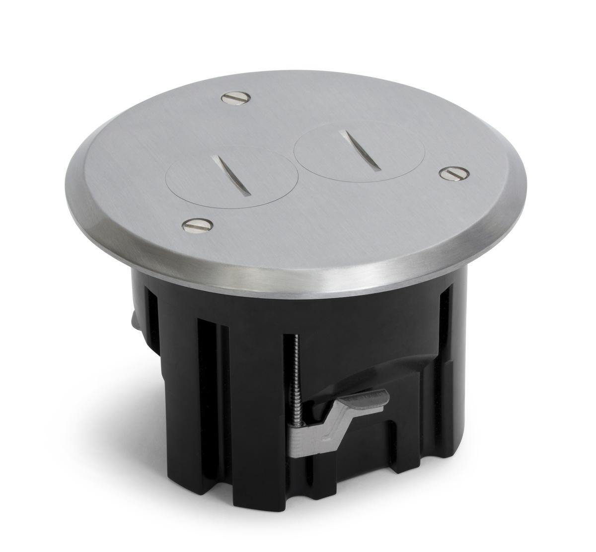 The Lew Electric PBR1-SPA is a round plastic power floor box with an aluminum cover. Inside the floor box is a duplex 15A power outlet, the round box has an interior capacity of 20 cubic inches (minus the outlet). The box is made of a lightweight yet durable polymer construction with adjustable wing clamps for added installation support. The box is very easy to install and extremely affordable compared to a traditional metal floor box. The cover is aluminum and features two screw plugs for secured access to your power.