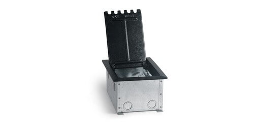 The Lew Electric RF9C4F is an affordable high quality raised access floor box that allows cables to be plugged in with the lid closed.