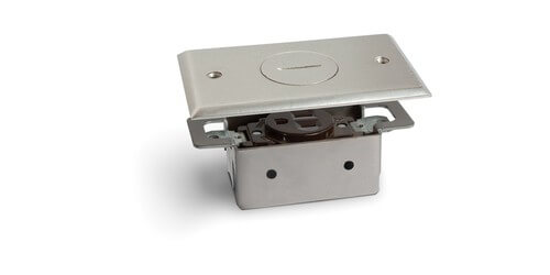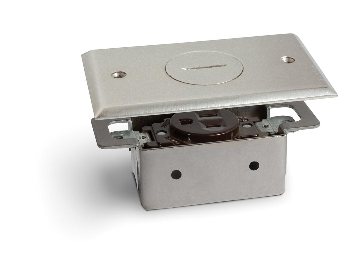 The Lew Electric RRP-1-NP is a floor box that holds (1) 15A tamper resistant power outlet, the top nickel plate features one secure access point. The box meets NEMA WD1-1983 heavy duty requirement for display receptacles, the box and outlet are UL listed. The box features a water tight assembly and includes a neoprene gasket. The box is adjustable and can accommodate any thickness floor up to 3/4".
