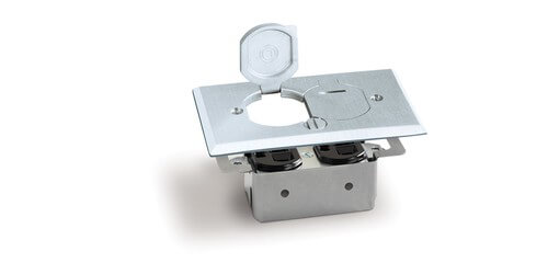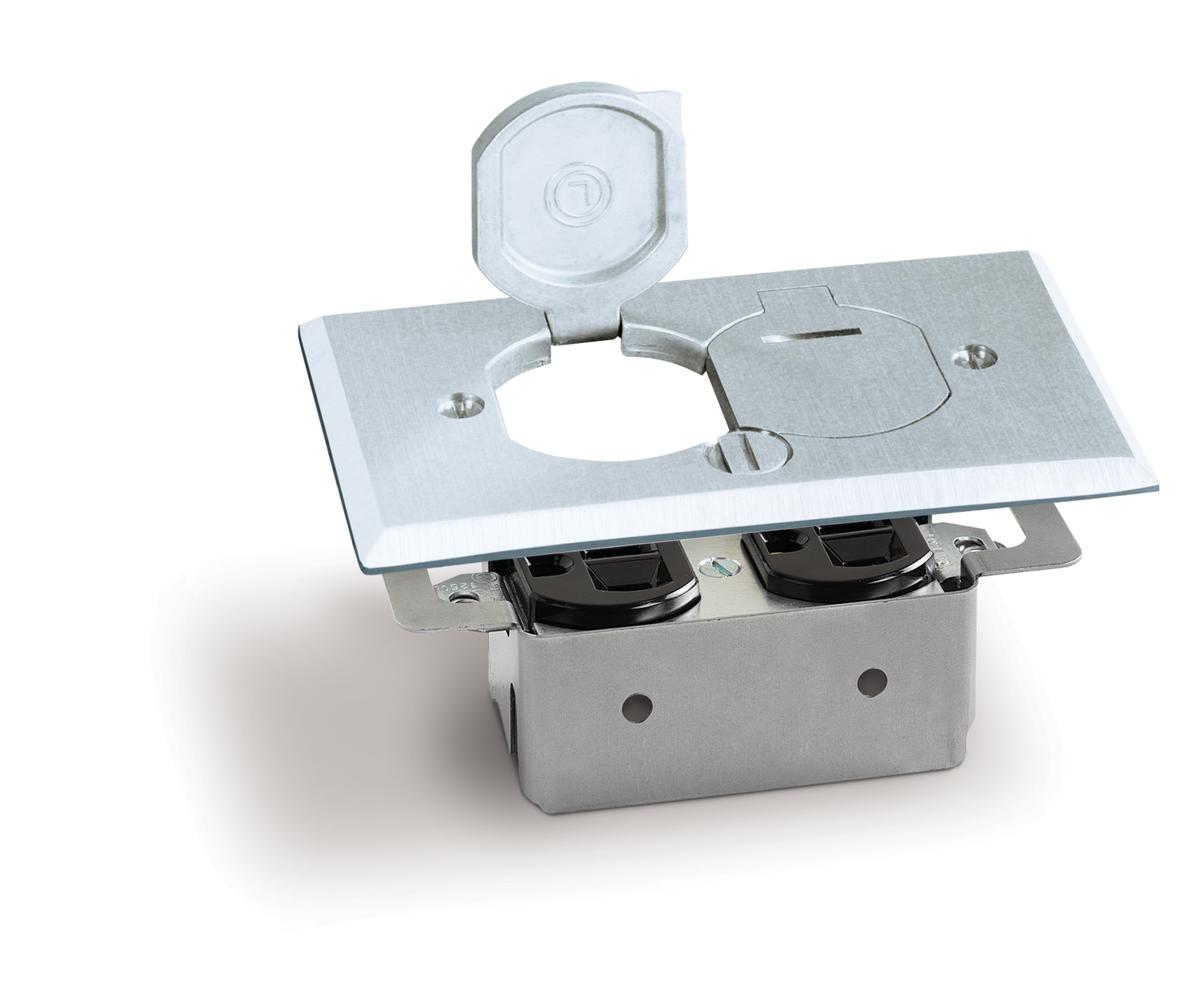 The Lew Electric RRP-2-LR-A is a floor box that holds (2) 15A tamper resistant power outlets, the top aluminum plate features two flip up lids. The box meets NEMA WD1-1983 heavy duty requirement for display receptacles, the box and outlet are UL listed. The box features a water tight assembly and includes a neoprene gasket. The box is adjustable and can accommodate any thickness floor up to 3/4".