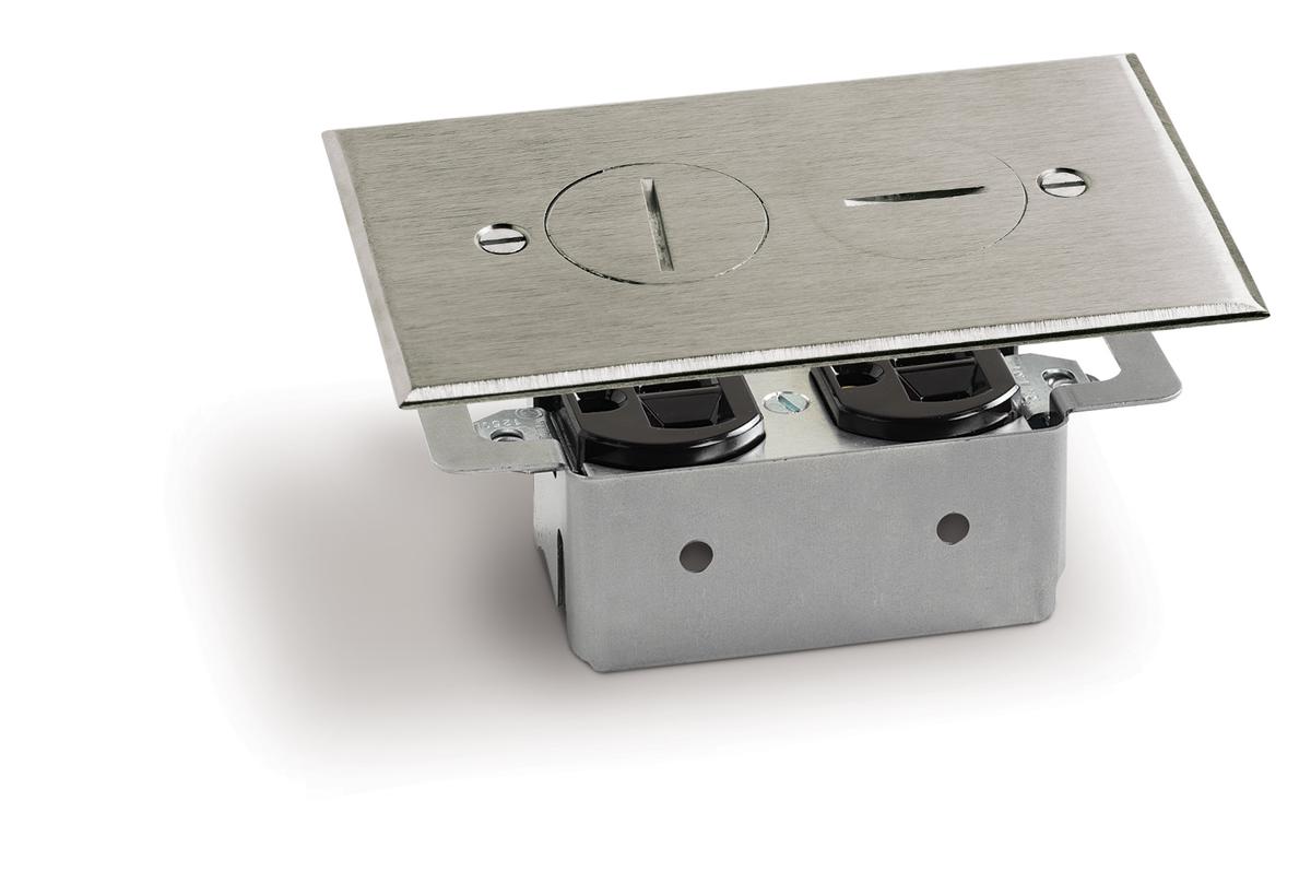The Lew Electric RRP-2-NS is a floor box that holds (2) 15A tamper resistant power outlets, the top nickel silver plate features two secure access plugs. The box meets NEMA WD1-1983 heavy duty requirement for display receptacles, the box and outlet are UL listed. The box features a water tight assembly and includes a neoprene gasket. The box is adjustable and can accommodate any thickness floor up to 3/4".